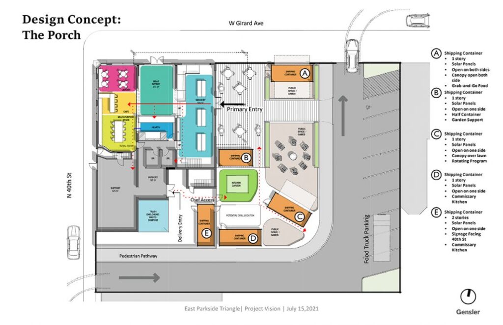 We’re developing a food as medicine and health/wellbeing destination that features access to healthy foods with curated healthy food retail/trucks and space for a farmer’s market and another community gathering space. Anchor tenant, Thrive Medical, will provide access to occupational therapy, occupational medicine and restorative health practices. In addition, in partnership with [nonprofit organization] Community Transformation Partners, Thrive Café will use some of the commercial space to operate a community co-op café as a community gathering space. We are designing the “Porch” as an outdoor eating space for the healthy food retail court. For those of us who grew up in Philly, the porches, or steps, are important areas to how we experience neighborhoods and build communities. The Porch will be an outdoor community gathering space, named after my mother’s porch, right here in West Philadelphia where my family, friends, and I still come together and laugh, catch up, and create memories. In addition, the property has nine affordable apartments.